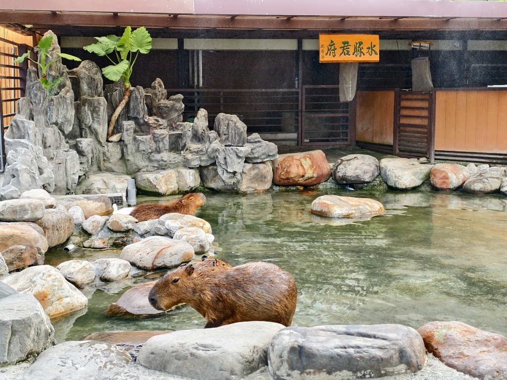 水豚君們全身毛毛的,動作慢悠悠,看著就心情很好。有些在水裡泡澡,有些會主動走過來討食物