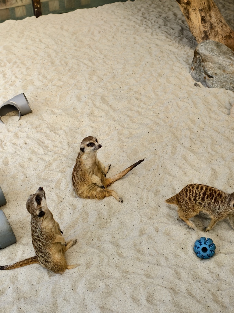 狐獴們住在沙地裡,一直東張西望,有時還會直立起來觀察四周