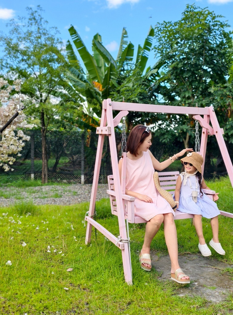 粉紅木鞦韆:坐在上面盪鞦韆,小孩笑聲不斷,也是親子合照的好場景
